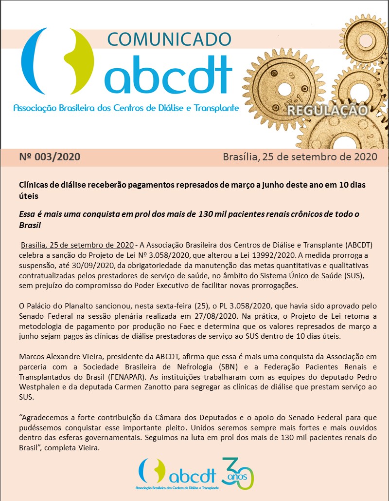 Comunicado Nº 003-2020 – Clínicas de diálise receberão pagamentos represados de março a junho deste ano em 10 dias úteis