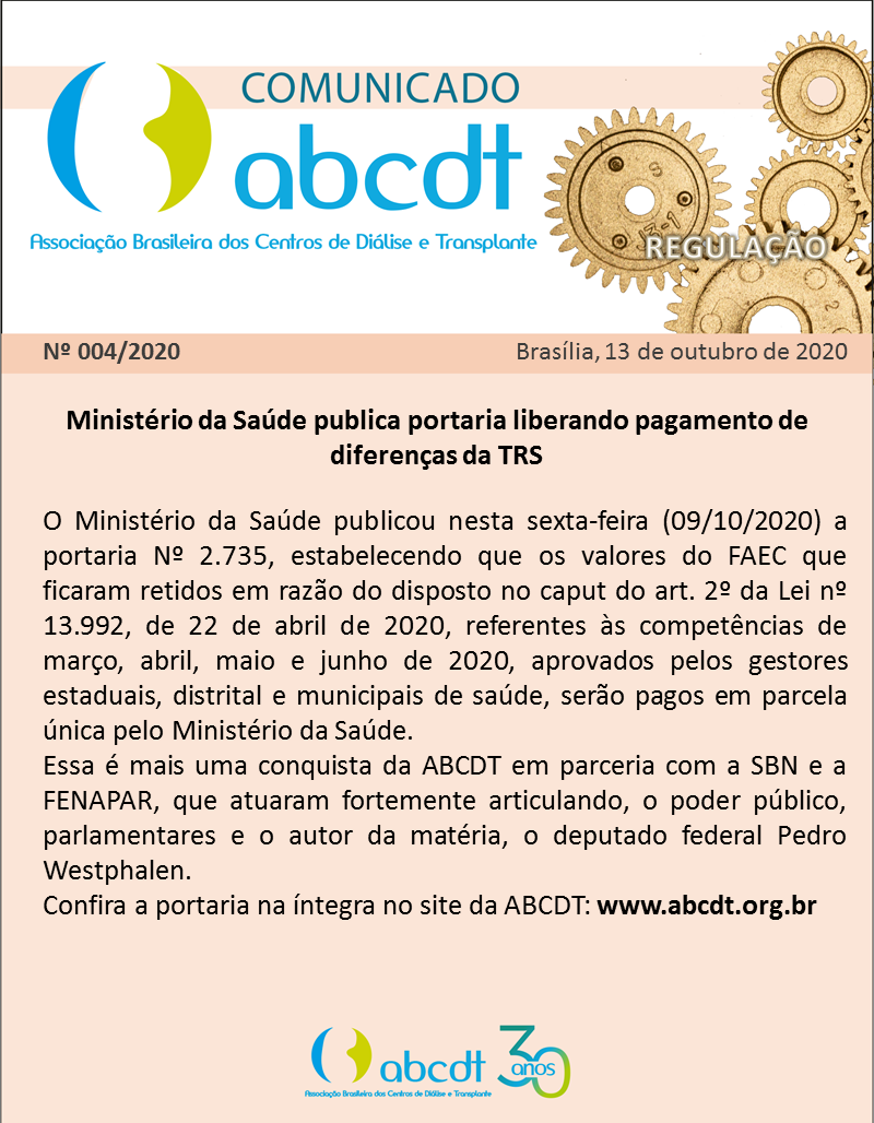 COMUNICADO Nº 004-2020 – MINISTÉRIO DA SAÚDE PUBLICA PORTARIA LIBERANDO PAGAMENTO DE DIFERENÇAS DA TRS