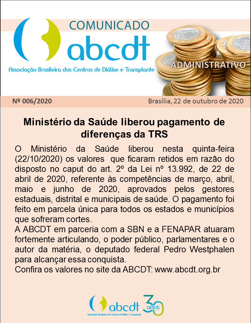 COMUNICADO Nº 006/2020 – MINISTÉRIO DA SAÚDE LIBEROU PAGAMENTO DE DIFERENÇAS DA TRS