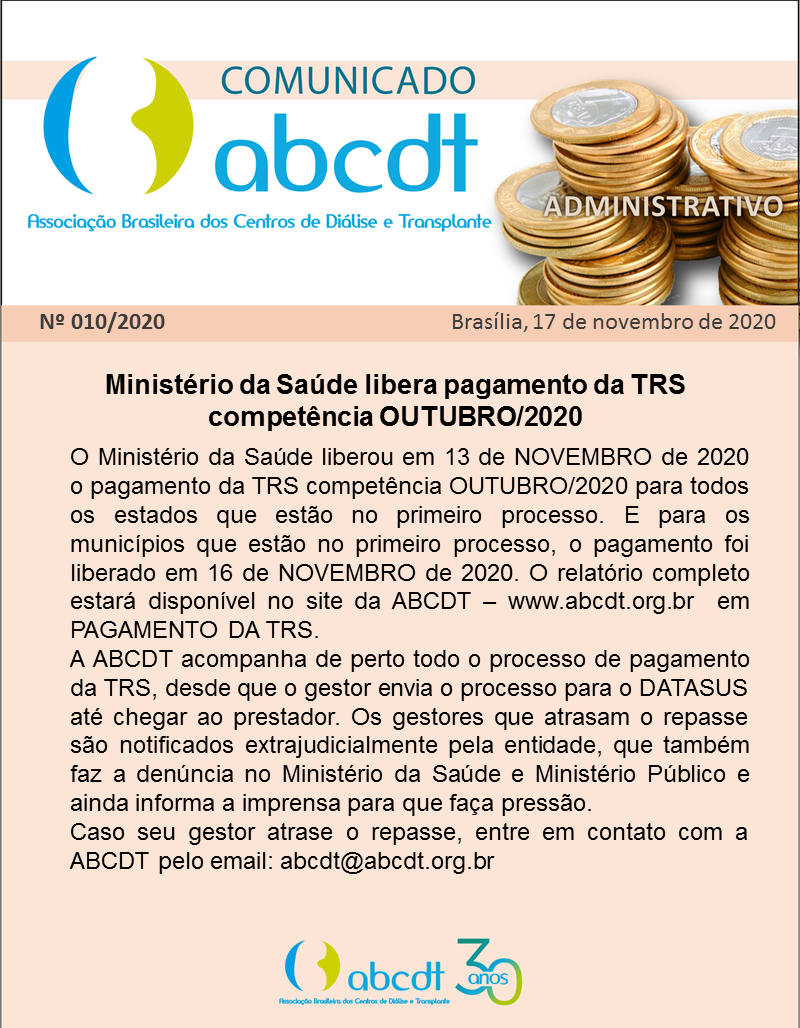 COMUNICADO Nº 010/2020 – MINISTÉRIO DA SAÚDE LIBERA PAGAMENTO DA TRS COMPETÊNCIA OUTUBRO/2020
