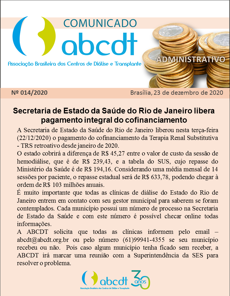COMUNICADO Nº 014/2020 – SECRETARIA DE ESTADO DA SAÚDE DO RIO DE JANEIRO LIBERA PAGAMENTO INTEGRAL DO COFINANCIAMENTO