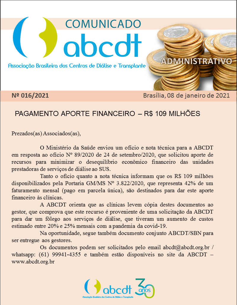 COMUNICADO Nº 016/2021 – PAGAMENTO APORTE FINANCEIRO – R$ 109 MILHÕES