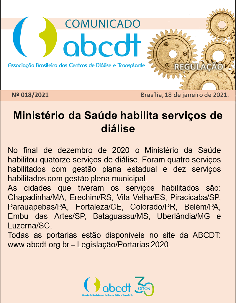 COMUNICADO Nº 018/2021 – MINISTÉRIO DA SAÚDE HABILITA SERVIÇOS DE DIÁLISE