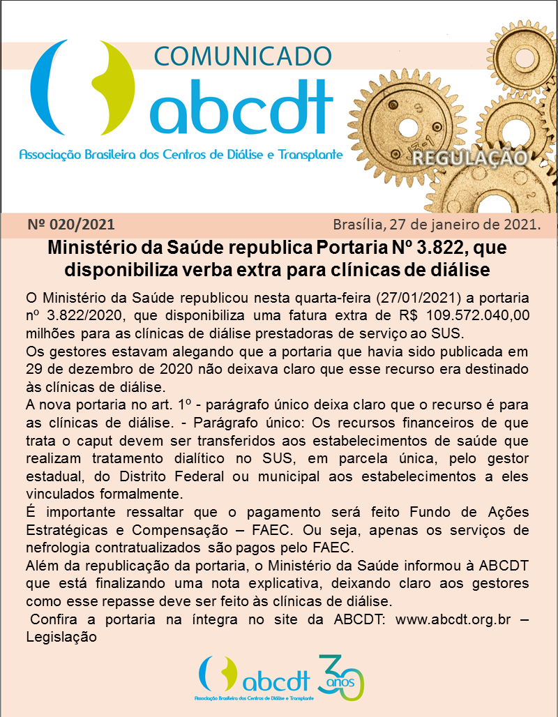 COMUNICADO Nº 020/2021 – MINISTÉRIO DA SAÚDE REPUBLICA PORTARIA Nº 3.822, QUE DISPONIBILIZA VERBA EXTRA PARA CLÍNICAS DE DIÁLISE