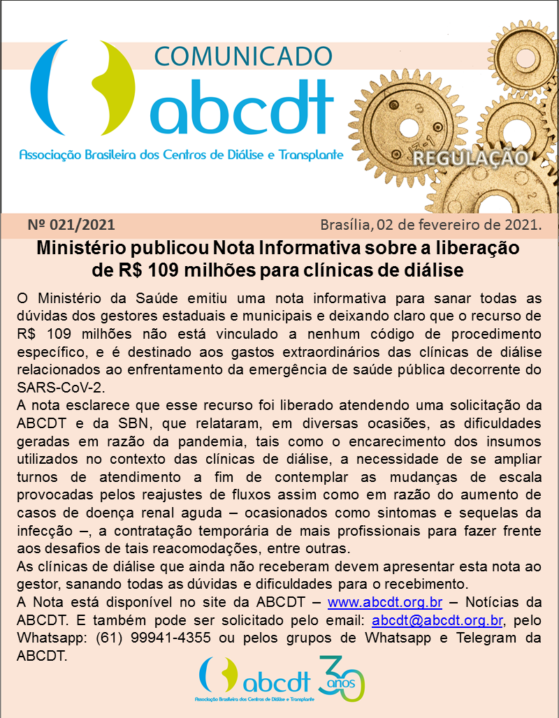COMUNICADO Nº 021/2021 – MINISTÉRIO DA SAÚDE PUBLICOU NOTA INFORMATIVA SOBRE A LIBERAÇÃO DE R$ 109 MILHÕES PARA CLÍNICAS DE DIÁLISE