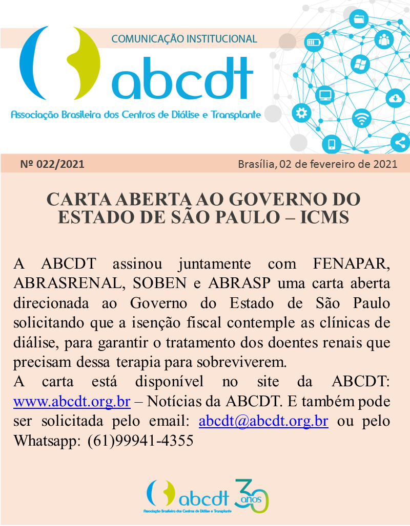 COMUNICADO Nº 022/2021 – CARTA ABERTA AO GOVERNO DO ESTADO DE SÃO PAULO – ICMS