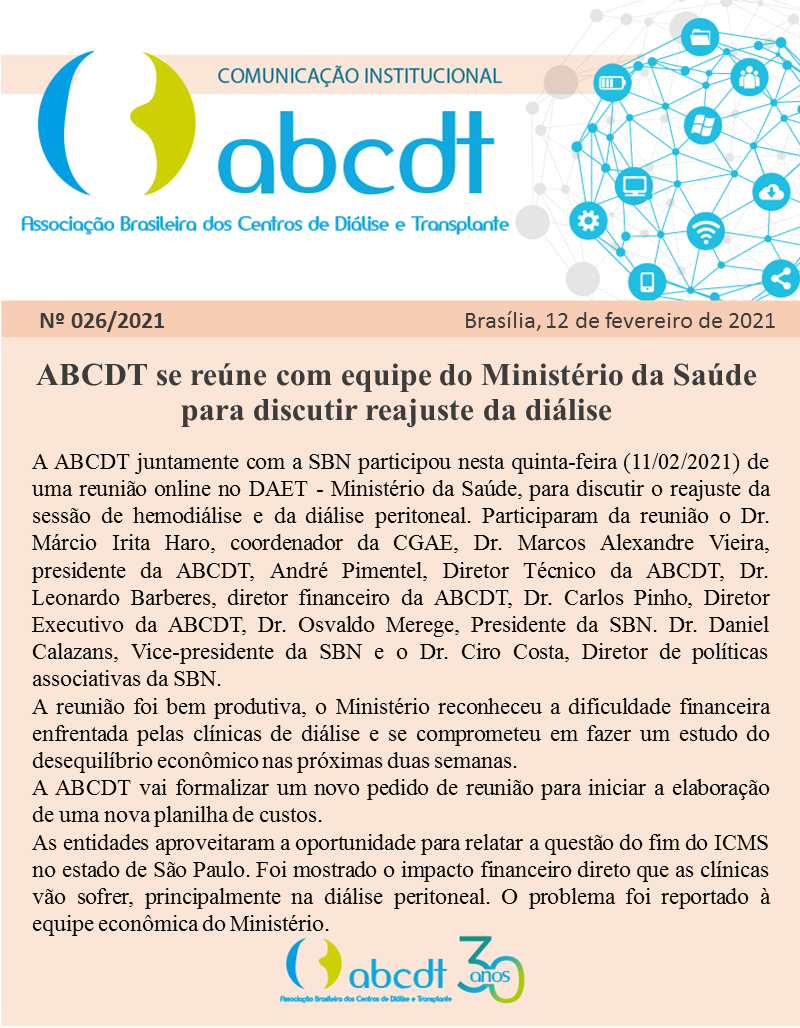 COMUNICADO Nº 026 – ABCDT SE REÚNE COM EQUIPE DO MINISTÉRIO DA SAÚDE PARA DISCUTIR REAJUSTE DA DIÁLISE