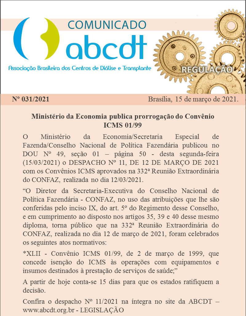 COMUNICADO Nº 031/2021 – MINISTÉRIO DA ECONOMIA PUBLICA PRORROGAÇÃO DO CONVÊNIO DO ICMS 01/99