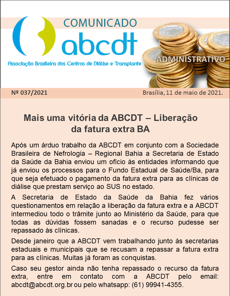 COMUNICADO Nº 037/2021 – MAIS UMA VITÓRIA DA ABCDT – LIBERAÇÃO DA FATURA EXTRA BA