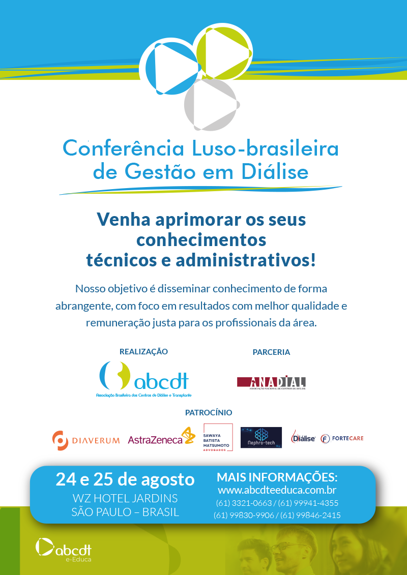 Vem aí… a primeira Conferência Luso brasileira de Gestão em Diálise. O evento irá reunir experts do Brasil e Portugal para compartilhar conhecimentos e discutir práticas e ideias contribuindo com geracao de conhecimento coletivo especializado para a diálise.